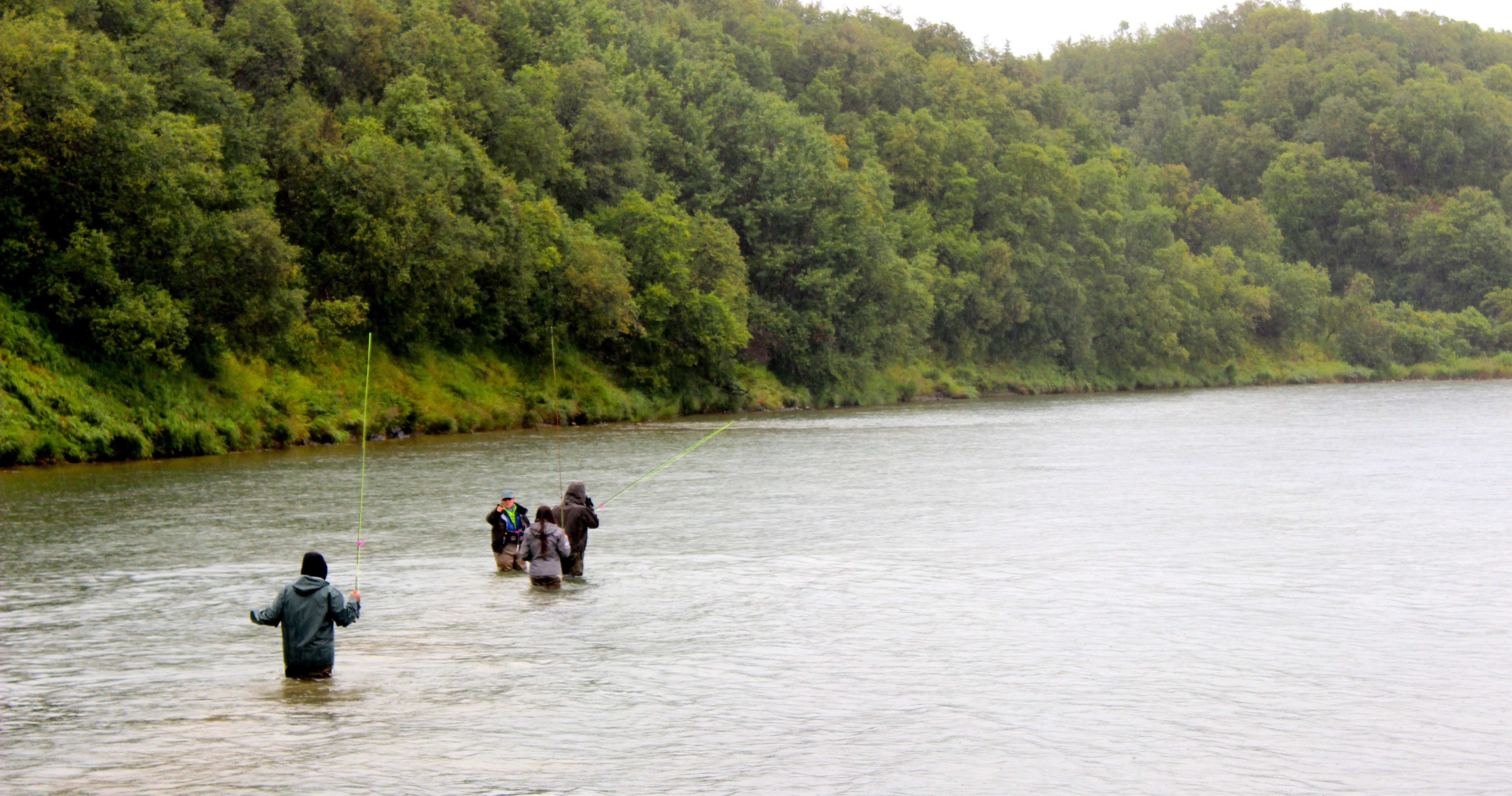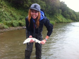 10:30 To the Vans! Instructors doled out waders and boots, packed up newly tied flies, donned raingear and headed to the river. Students tied on dry flies for rainbows and wild and crazy pink and purple flies (one of which was named, “Fancy Nanci” after our instructor) for silvers. Happy to report… it was a success! Nothing like standing in the rain for hours and not having a single complaint from the kids. These students are accustomed to the Alaska weather in August, and are determined to perfect their cast and bring in fish! (Picured below: hands-on instruction on the Newhalen)