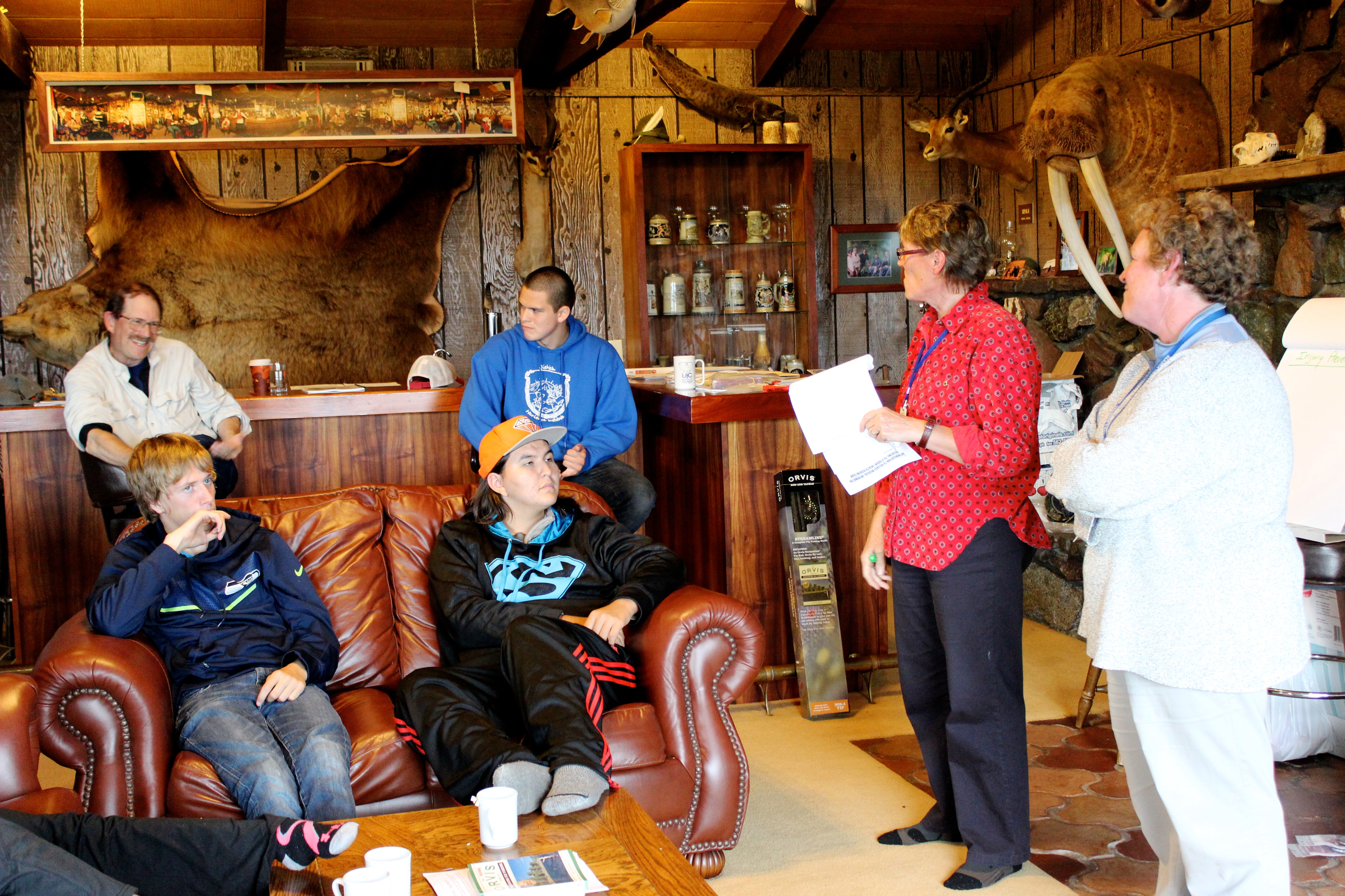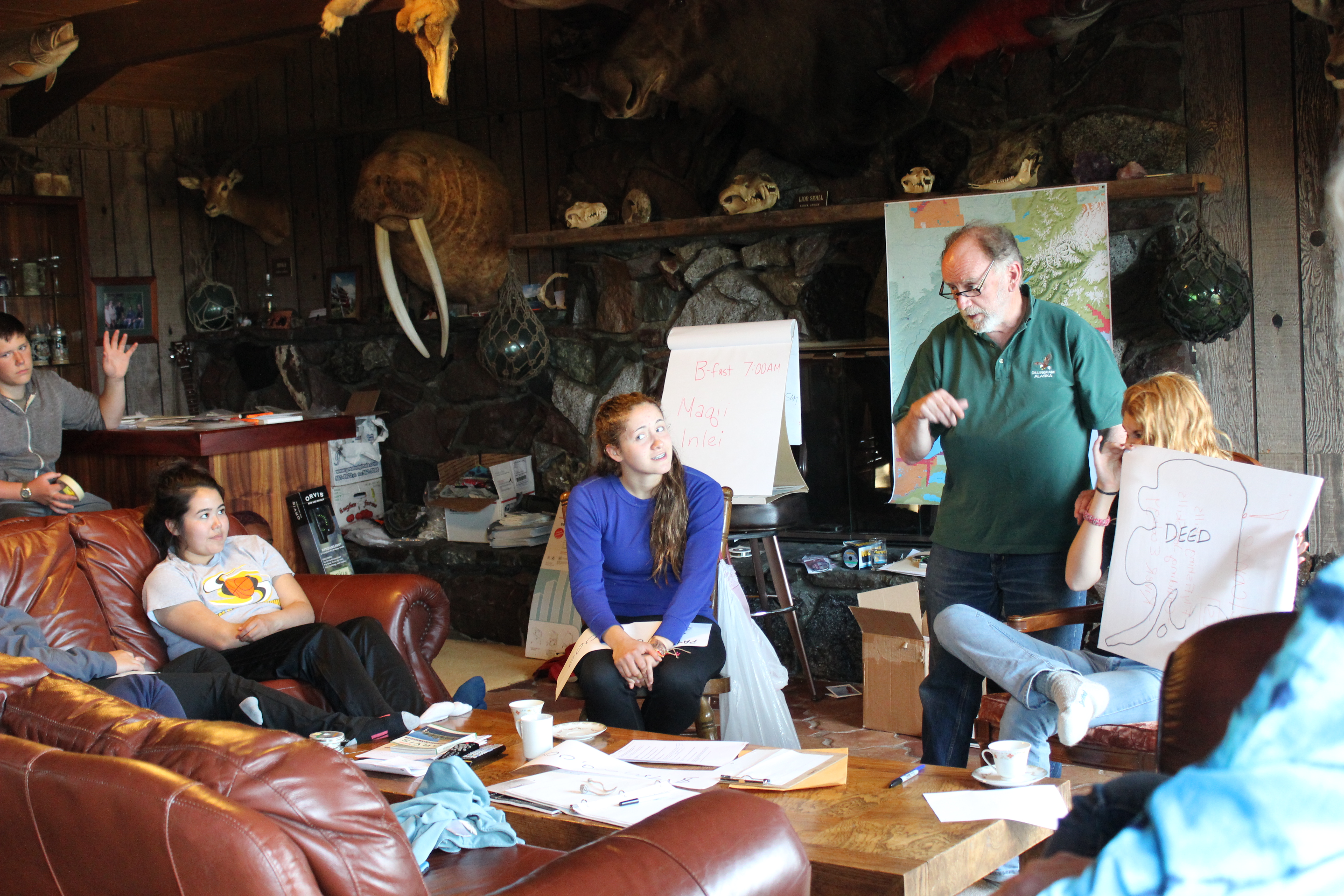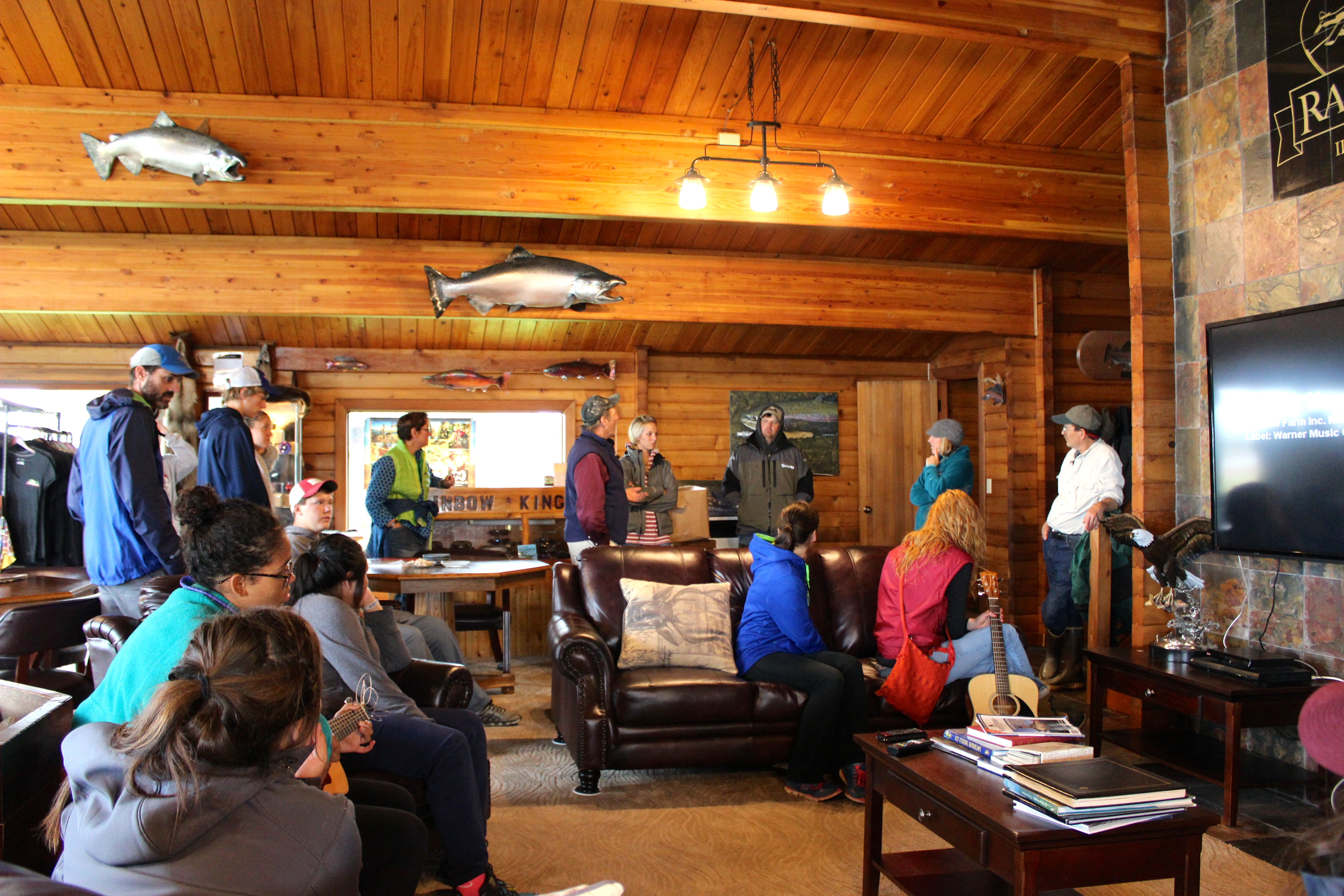 2:00 Behind the scenes tour of Rainbow King Lodge. After rushing back to the lodge, changing and rushing back to the vans, we arrived for a tour of Rainbow King Lodge in Iliamna. Managers, Becky and Craig, showed the students the front and back of the lodge and emphasized important characteristics of their guides. While background knowledge in fishing is a plus they said, Becky and Craig look for guides who are patient, get enjoyment from clients bringing in a great catch, and who are also reliable. Students made mental notes as they prepare for mock client day on Sunday. Becky and Craig also emphasized the importance of the need to give clients a safe and high-quality experience each day on the water.